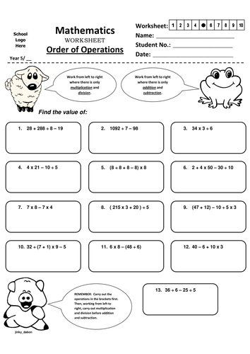 PDF Multiply and Divide Before You Add and Subtract OPS 1 - Math Antics Order of Operations • mathantics.com. Order of Operations: From Left To Right. Instructions: Use the Left To Right Rule to simplify each expression. Write your answer in the space provided and be sure to show your work. 2 + 8 10. 1. 6 − 4 + 8 = 10. 3. 20 ÷ 5 × 4 = 2. 30 ÷ 3 ÷ 5 = 5. Printable Order of Operation Worksheets - ThoughtCo Science, Tech, Math › Math Order of Operation Worksheets - With Parenthesis - no Exponents (6 Worksheets) By Deb Russell Updated on September 03, 2019 01 of 06 Worksheet # 1 of 6 (Answers on Pg. 2 of PDF) Worksheet 1. D. Russell Print Worksheet # 1 of 6 with answers on the second page of the PDF. 02 of 06